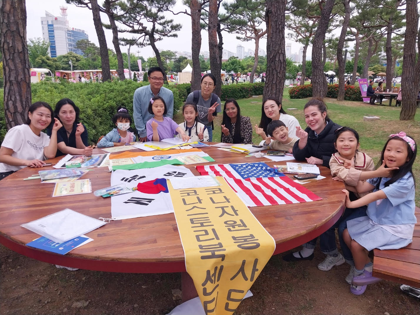 Once we arrived at Gwangju City Hall, I was amazed by the number of people who were attending the event. So many families with children of all ages and many international participants from all over the world were gathered inside and outside the City Hall venue. We walked past the booths that had been set up, and I got to hear about different city policies that were being proposed and voted on by members of the community. So many different countries were represented in activity booths, with games, art projects, and presentations available for the kids and visitors present. I was able to try different foods from countries all over the world and meet many members of the international community in Gwangju. As a KONA volunteer, I got to work with students on English reading practice and listen to their Korean folktale presentations.