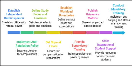 - Mandatory anti-bullying, psychological hygiene, and stress-management training. Graduate students are already required to complete online anti–sexual abuse education modules. The same infrastructure could be used to deliver annual mandatory education on anti-bullying practices, psychological hygiene, and stress management. These trainings should cover recognizing toxic dynamics in labs, self-care techniques, and how to seek help without fear of retaliation.
